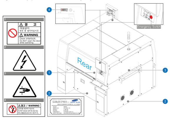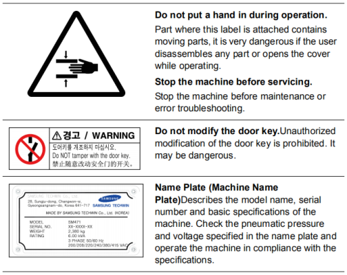 Following labels described in each section are attached on specific position of this machine. Follow the instructions on each label for operating this machine safely. If a label has come off or has damaged, put a new one on a specific position referring to the following figures. For ordering a new label or offering any comment, questions, please contact to the business department or the local agent designated by Hanwha Techwin Co., Ltd.