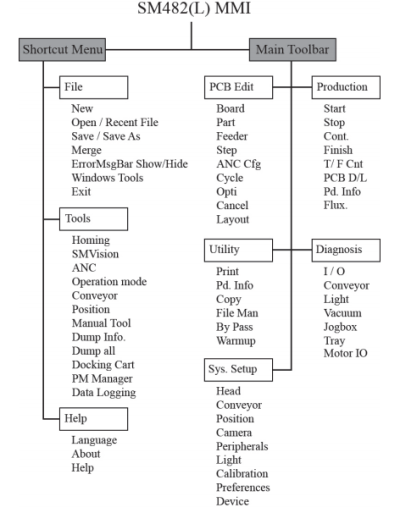 The menu structure and the functions of each menu of MMI (Man-Machine Interface), which serves as the application program for the operation of this machine, are briefly explained in this chapter. For detailed information on each menu, please refer to “Chapter 6Board Definition” ~ “Chapter 16 Production Information Management”.
